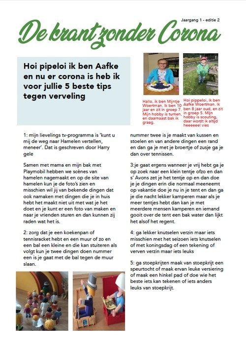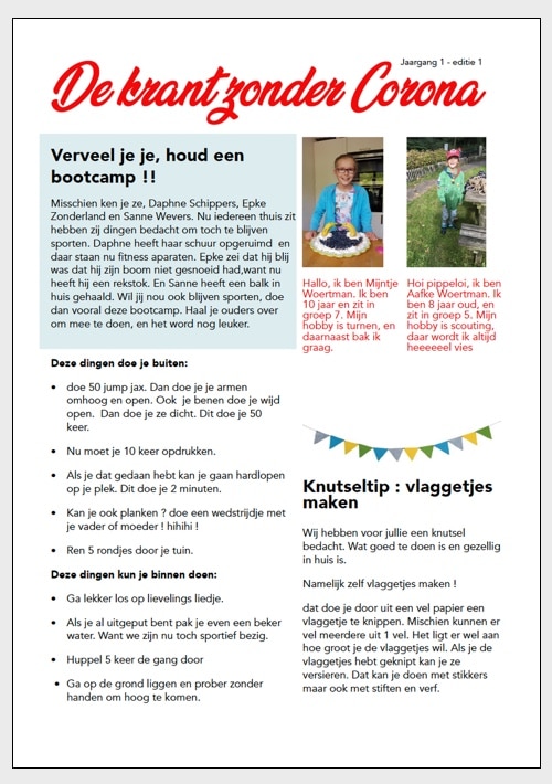de krant zonder corona3 Mijntje (10) en Aafke (8) hebben een krant zonder Corona gemaakt. Gewoon om even een dagje zonder Corona nieuws te beleven. Dus, ben je het ook een dagje zat om alleen maar vreselijk nieuws te bekijken – geniet dan van deze mooie krant.Eerste editieTweede editieGeplaatst in Nieuwe producten← Corona – 5 activiteiten waar iedereen aan mee kan doenEen plasticvrije vakantie →