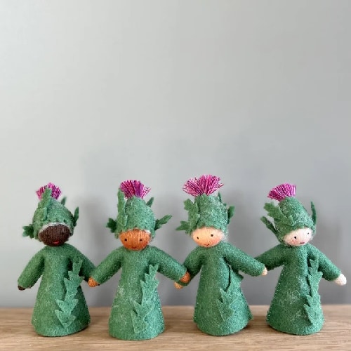 Ambrosius Fee Distel. Een mooi feetje in een groene jurk met een paarse bloem op haar hoed, ze ziet eruit alsof ze zo aan je vastkleeft. Net als een echte distel blijft vastklitten. Handgemaakt wolvilten poppetje voor op je seizoenstafel.