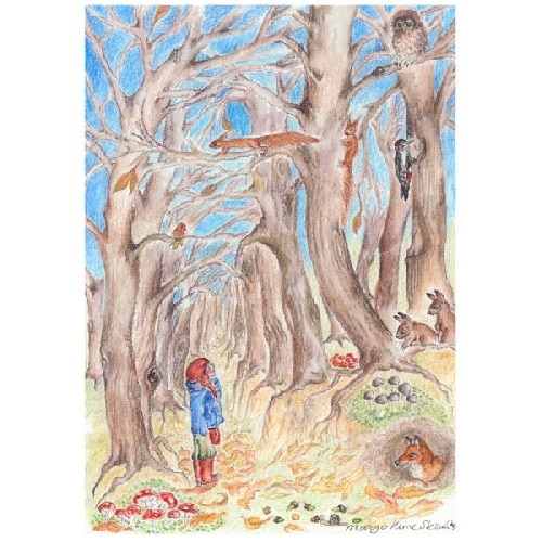 Ansichtkaart Avonturenbos. Deze mooi kaart is getekend door Margo (eentje van Margo). Gedrukt op ansichtkaartformaat, a6. De kaarten van Margo staan zo mooi op je seizoenstafel.