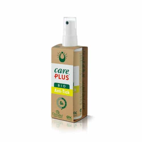 Biologische Anti-tekenspray van CarePlus. Een flesje met een inhoud van 80 mililiter. Deze spray beschermt tot zo’n zes uur teken. Het kan gebruikt worden door kinderen vanaf drie maanden en is ook veilig te gebruiken als je zwanger bent of borstvoeding geeft. Daarnaast is het verstandig om, als je er op uit trekt in een tekengebied (hoog gras/ bos), dichte schoenen, sokken en lange mouwen aan te trekken.