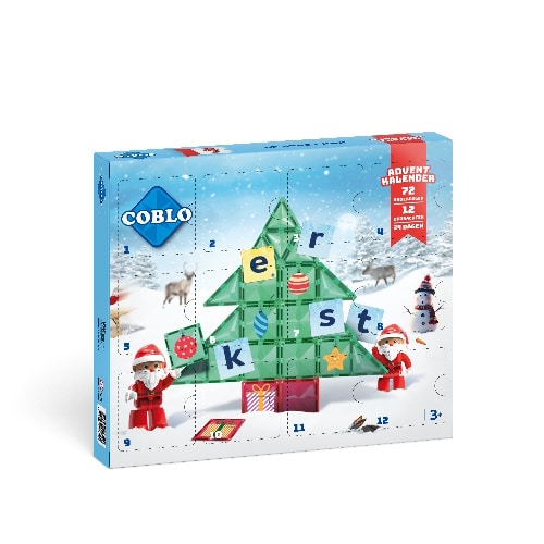 Coblo Adventskalender. Hoe leuk! Een adventskalender met magnetische tegels. Je maakt elke dag een vakje open en in totaal krijg je dan 44 tegeltoppers (plaatjes die je op de magnetische tegels kunt kleven), 28 nieuwe tegels (met kerstafbeeldingen, in groen, in rood, maar ook een magnetisch figuurtje van de Kerstman) en diverse bouwopdrachten.