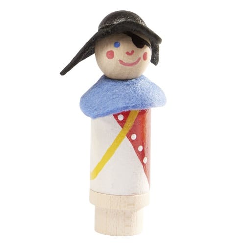 Gluckskafer stekers piraat: een houten steker in de vorm van een poppetje, aangekleed met vilten kleertjes wat deze steker een echte piraat maakt. De hoogte van deze steker is ongeveer 8,5 centimeter en uiteraard past deze in de Gluckskafer verjaardagsring. Overigens passen de stekers van Gluckskafer ook in de verjaardagsring van Grimm’s.