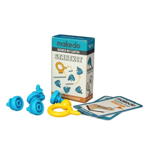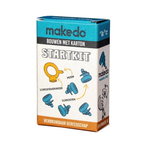 Makedo Startkit. Een compact doosje met alles wat je nodig hebt om te gaan knutselen met karton. Je vindt in dit doosje 5 schroeven, een mini-gereedschapje en 2 leuke bouwvoorbeelden. Oja en het doosje pas precies in je schoen, handig voor de decembermaand 😉