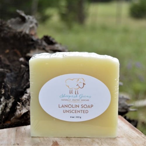 Sheepish Grins wolwaszeep met lanoline. Verkrijgbaar in diverse geuren. Verzorgend voor je wolletjes. Blok van ongeveer 115 gram.
